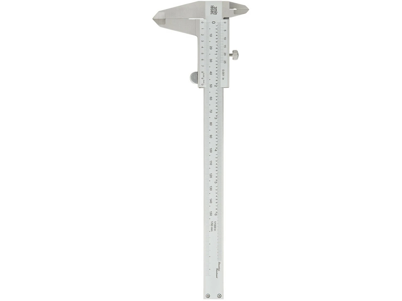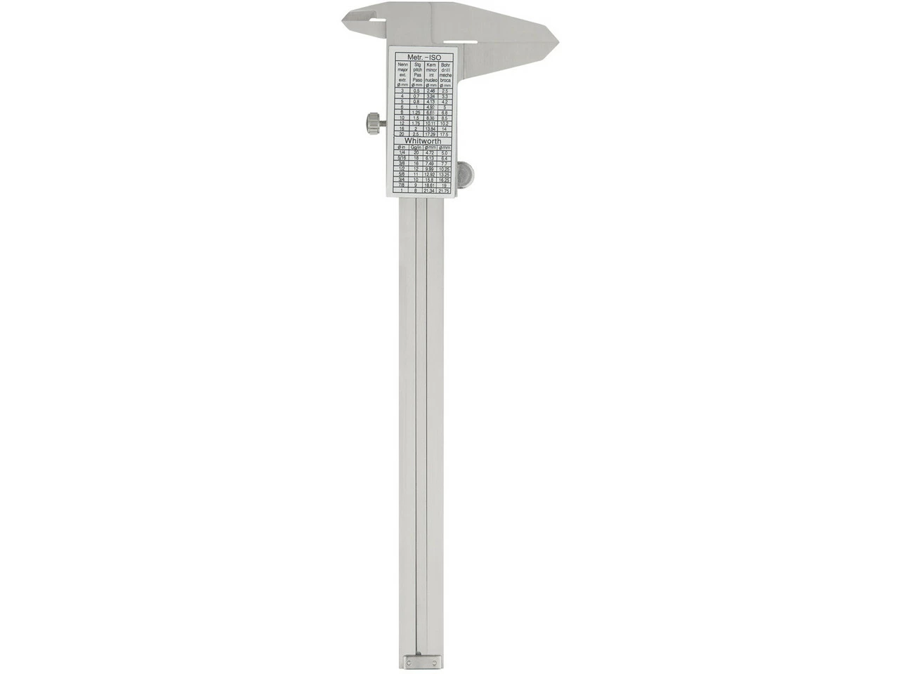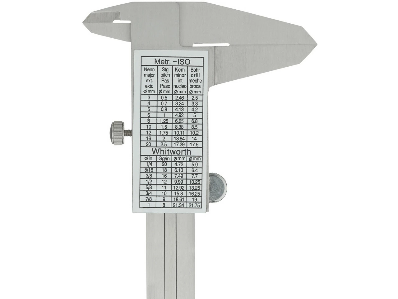 Der Messschieber von 3min19sec weist einen Messbereich von 150 mm auf der Hauptskala und eine sehr hohe Genauigkeit von 1/50 auf der Nonius-Skala auf. Es lassen sich damit Außendurchmesser, Innendurchmesser, Absätze und Tiefe exakt bestimmen. Die Schieblehre besteht aus gehärtetem, rostfreiem Stahl und verfügt über eine Feststellschraube. Auf der Rückseite findest Du eine praktische Tabelle mit metrischen ISO-Gewinden und den zugehörigen Kernlochdurchmessern sowie Gewindesteigungen. Das Werkzeug wird mit einer Aufbewahrungsbox aus Kunststoff geliefert.