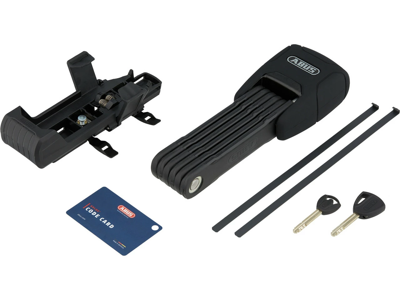 Lieferumfang:1 x Faltschloss ABUS Bordo Granit 6500K1 x Halter ABUS SH2 x Spanngurt2 x Schlüssel1 x ABUS Plus Code Card1 x Batterie CR2 (integriert)