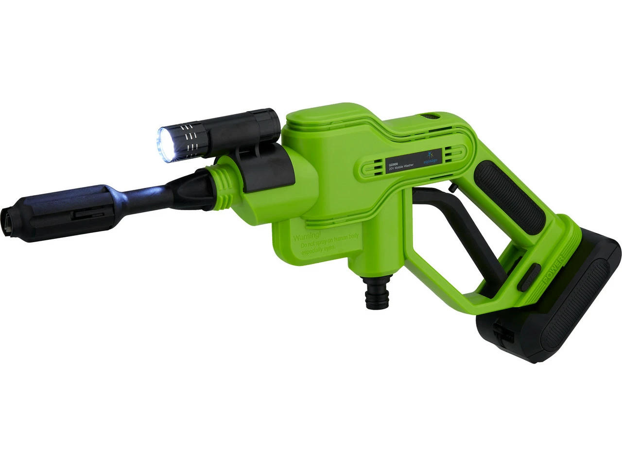 Lieferumfang:1 x Druckreiniger aqua2go1 x Sprühlanze1 x Düsenkopf1 x Saugschlauch1 x Lithium-Ionen-Akku, 20 V 2500 mAh1 x Netzladegerät1 x Transportkoffer1 x Leuchte6 x Dichtring
