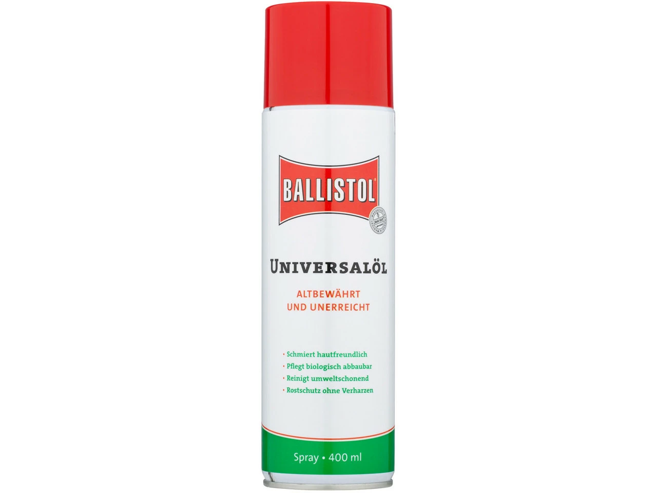 Auszeichnungen:Ballistol ist absolut hautfreundlich und wurde von Dermatest mit “ Sehr Gut“ getestet.Die Zeitschrift “ selbst ist der Mann“ berichtet in der Ausgabe Nr. 7 / Juli 2013 über Ballistol Universalöl. “ selbst ausprobiert“ verlieh diesem Öl 5 Hämmer von 5.Features:pflegt, schmiert, desinfiziert, schützt vor Rostkriecht in feinste Winkel, ist gleitaktivverharzt nicht, ist biologisch vollständig abbaubarlebensmittelecht, hautverträglich und völlig unbedenklichder Geheimtipp für Heimwerker, Industrie und Handwerkreinigt Ketten, Federgabeln und Bowdenzügeideal zum Einwintern und Restaurierenbestens geeignet zur Reinigung und Pflege von Fox und RockShox FedergabelnHerstellernummern:50 ml:21450200 ml:21700400 ml:21810Lieferumfang:1 x Universalöl Ballistol Spraydose