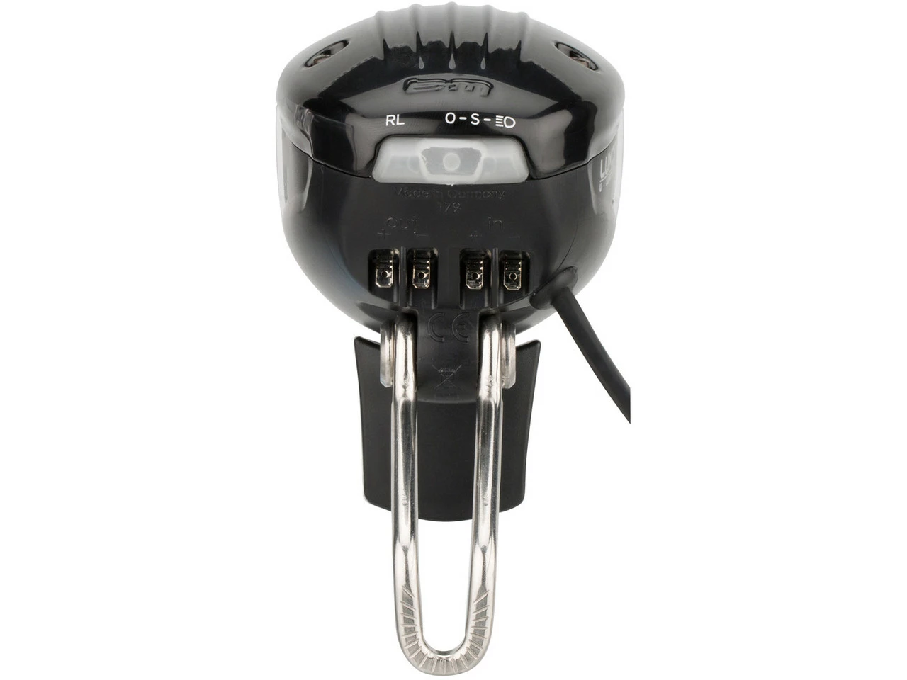 Technische Daten:Ausführung:Frontlicht (weiß)Montage:EdelstahlhalterLeuchtmittel:1 x LEDLeuchtkraft:70/90 LuxBetriebsmittel:NabendynamoTechnische Daten:Material:AluminiumStandlicht:Ja (abschaltbar)Schalter:Ein / Aus / Automatik (Sensor)Freigaben:Zulassung im Straßenverkehr:Ja, für Fahrräder (nach §67 StVZO)Prüfziffer:K~~954Features:zusätzliche, elektronisch gesteuerte Spezial-LED sorgen unmittelbar vor und neben dem Fahrrad für ein exzellentes Panorama-Nahlichtmit der vollen Leistung aller Lichtquellen lässt sich ein wahres Flutlicht erzeugenper Knopfdruck zuschaltbares Flutlicht für schwierige Streckenabschnitte in tiefer DunkelheitZusatzfunktionen: Lichthupe (im Hellen), volles Licht (bei Dunkelheit im Stand)im Scheinwerfer integrierter Puffer-Akku sorgt für konstanten Ladestrominkl. Kabel für USB zum Aufladen diverser MobilgeräteLadezustand des Puffer-Akkus wird per LED am Lenker-Taster angezeigtintelligente Sensor-Automatik schaltet Signal-LED im Hellen auf maximales Tagfahrlicht und im Dunkeln auf maximales Fahrlichtmit ansteckbarem Frontrückstrahlermit Schalter für Naben-DynamoTechnologien:IQ2-Technik
