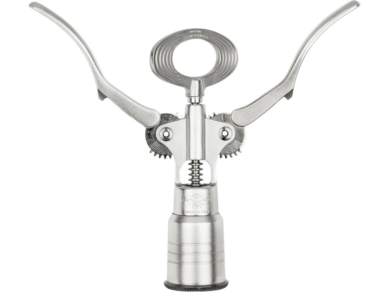 Der Korken lässt sich einwandfrei durch eine Teleskop-„Glocke“ herausziehen, denn der Korkenzieher passt sich jeder Flasche an und kann dadurch in der Schubphase besser greifen. Die eleganten Hebel sorgen beim Öffnen für eine symmetrische Bewegung und konzentrieren die ganze Kraft auf dem Korken. Der Korken wird präzise herausgezogen, ohne zu zerbrechen, sodass in feinsten Flaschen keine unerwünschten Rückstände zurückbleiben.