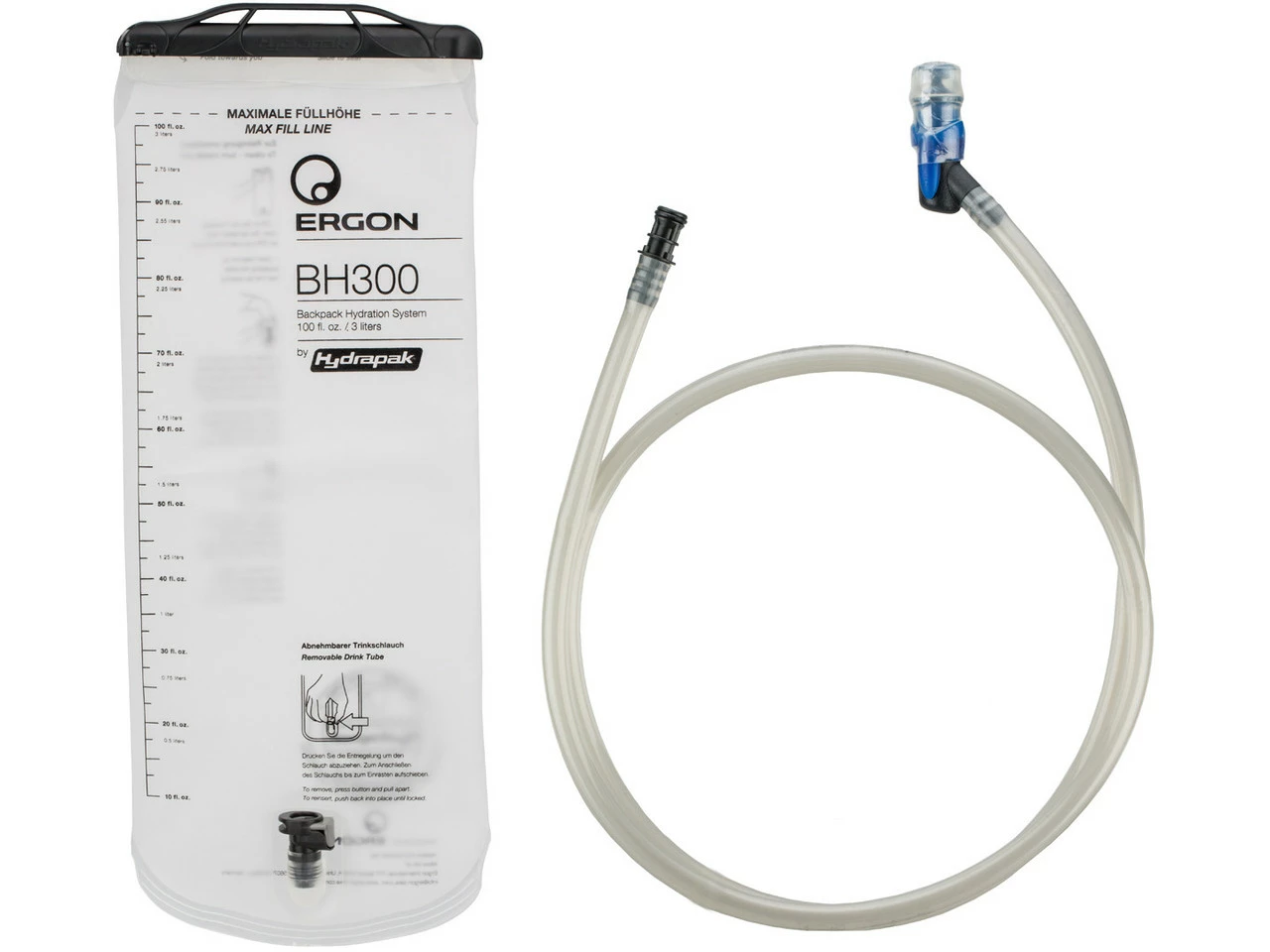 Spezifikationen:Volumen:3 LiterSchlauch:extra lang (127 cm)Kompatibilität:Ergon BX2, BX3, BA3, BC2Technische Daten:Material:Polyurethan, lebensmittelechtÖffnung:extra großFeatures:reißfestes, dehnbares Materialgroße, durchgängige Öffnung mit Schiebe-Verschluss für leichtes Befüllen bzw. Reinigenextra langer, geschmacksneutraler Trinkschlauch, unkompliziert per Plug-n-play an die Trinkblase anzuschließenmehrlagiger, verknicksicherer Schlauch135 Grad Beißventilinnenliegendes Sicherheitsventil gegen AuslaufenAufhängung mittels Trinkschlauchbefestigung (nicht im Lieferumfang enthalten)Lieferumfang:1 x Trinkblase Ergon BH300 Hydrapak1 x Schlauch1 x Mundstückohne Trinkschlauchbefestigung
