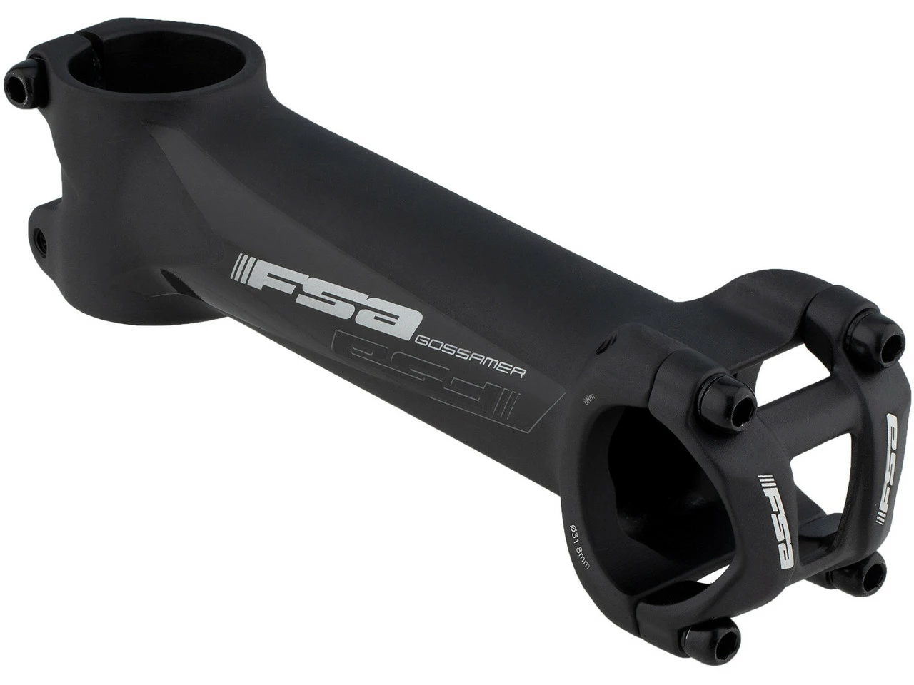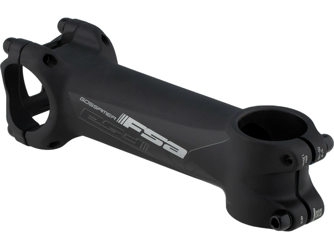 Der FSA Gossamer Road-Vorbau besteht aus CNC-bearbeitetem Aluminium, hat im Gegensatz zu seinem Vorgänger eine schwarze 4-Schrauben-Frontkappe und lässt sich im Winkel von 6° aufsteigend oder absteigend montieren.