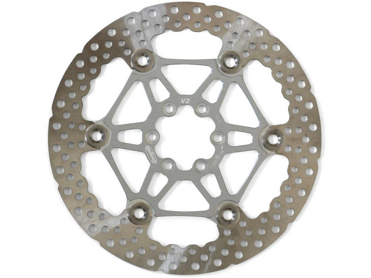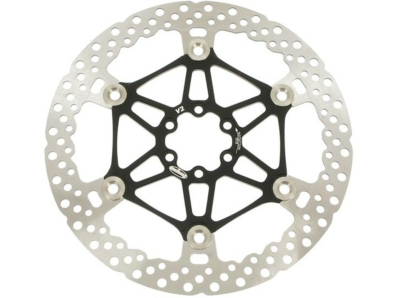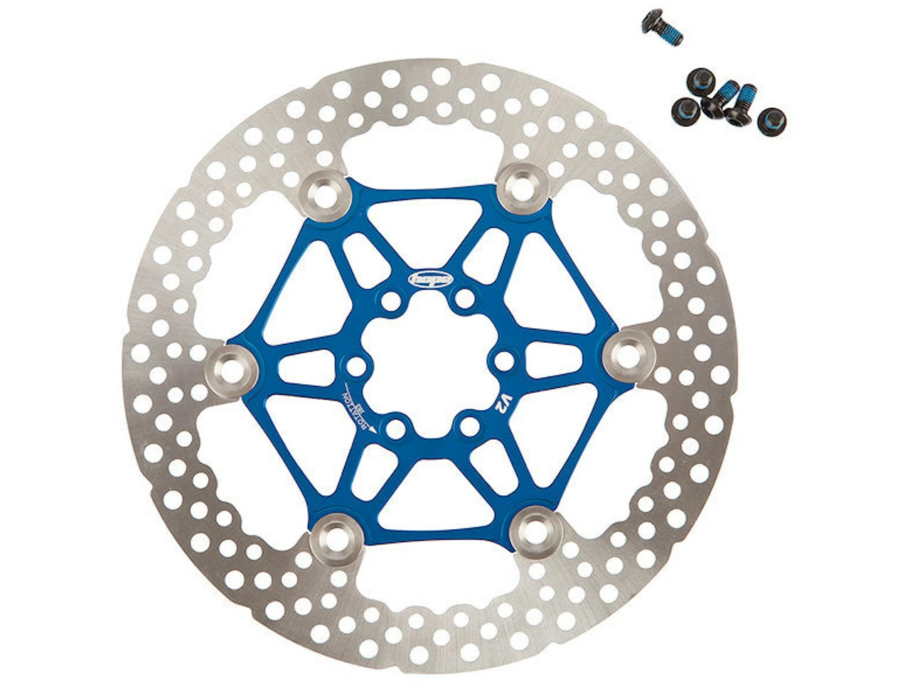 Die Hope MV2 Floating Bremsscheibe ist eine schwimmend gelagerte Bremsscheibe für die Moto FR V2 und Tech V2 Evo Bremse ab Modelljahr 2007. Die schwimmenden Scheiben sind unter Mountainbikern beliebt, da sie die Leistung optimieren und einfach auffallend sind. Die Bremsfläche aus Edelstahl wird an den Aluträger genietet. Diese Konstruktion spart Gewicht und die Scheibe kann sich bei Wärme ausdehnen und zusammenziehen, ohne verformt zu werden.