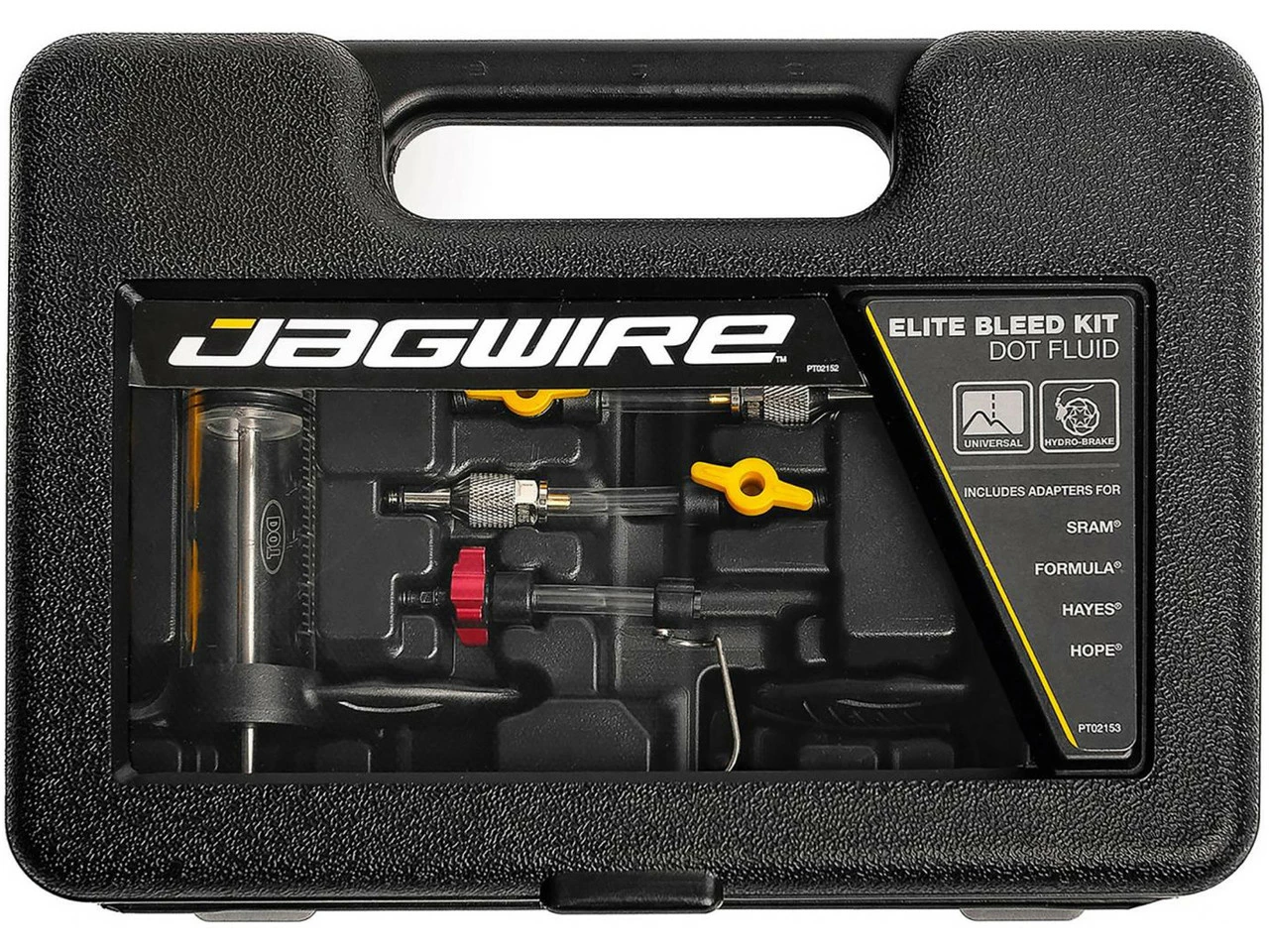 2 x Spritze Jagwire Premium2 x Universaladapter Jagwire mit Absperrventil1 x Entlüftungsblock Jagwire 2-Kolben1 x Entlüftungsblock Jagwire 4-Kolben 10,0 mm1 x Entlüftungsblock Jagwire 4-Kolben 11,8 mm1 x Spritzenhalter Jagwire gerade1 x Spritzenhalter Jagwire 90-Grad-Winkel1 x Adapterschlauch für Entlüftungsnippel1 x Adapter für SRAM1 x Adapter für Formula1 x Adapter für Hayes HFX-Serie1 x Adapter für Hope1 x Aufbewahrungskoffer