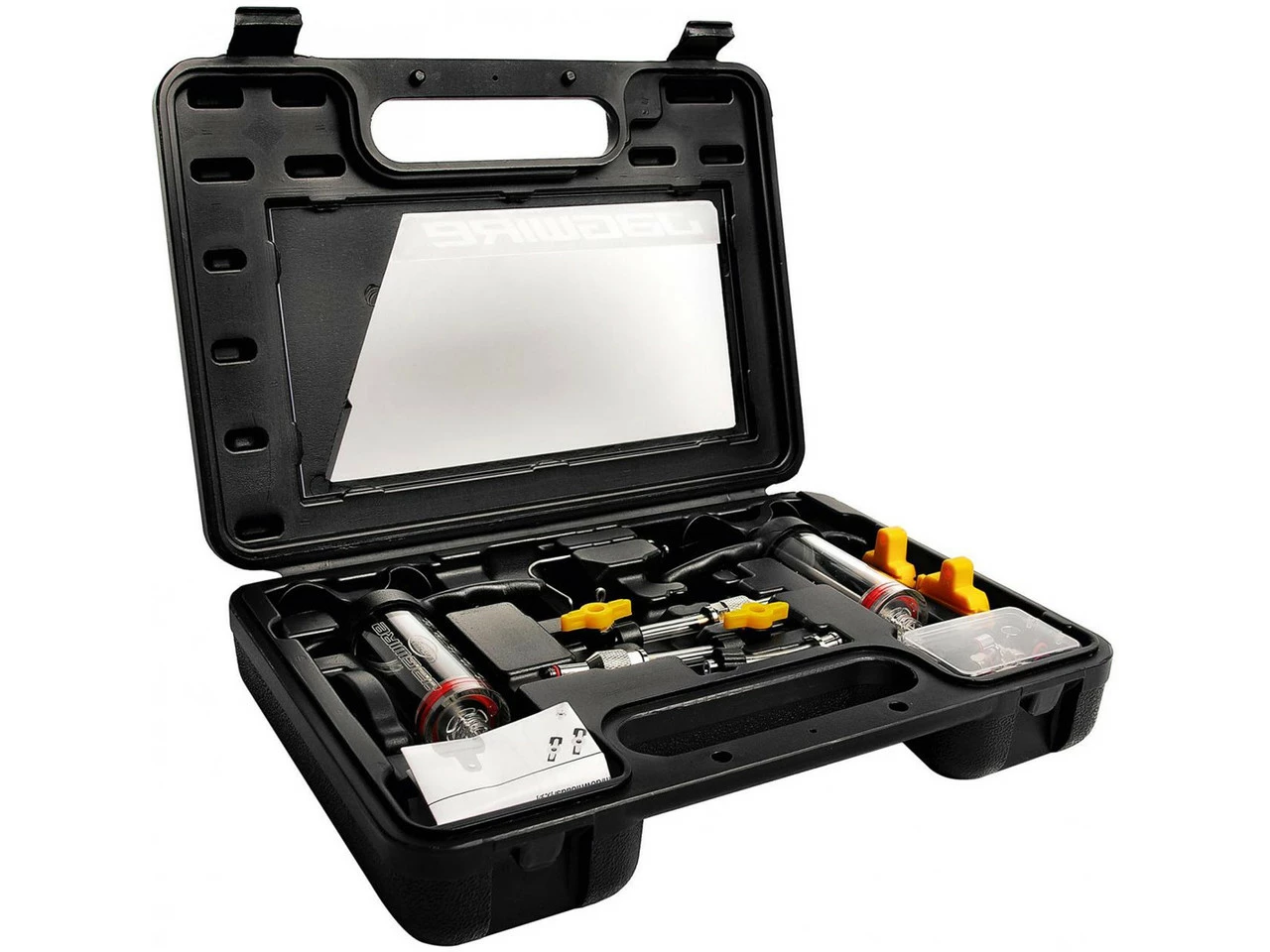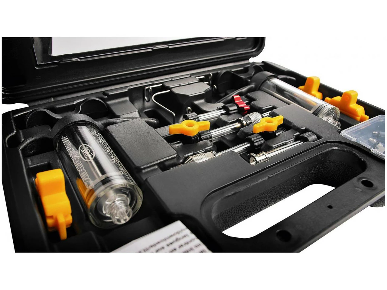 2 x Spritze Jagwire Premium2 x Universaladapter Jagwire mit Absperrventil1 x Entlüftungsblock Jagwire 2-Kolben1 x Entlüftungsblock Jagwire 4-Kolben1 x Spritzenhalter Jagwire gerade1 x Spritzenhalter Jagwire 90-Grad-Winkel1 x Schlauchhalter1 x Adapterschlauch für Entlüftungsnippel1 x Adapter für Shimano-Bremshebel mit integriertem Entlüftungsanschluss2 x Schlauch mit Klemmhülse für Shimano Entlüftungsnippel1 x Adapter für Magura MT Hebel1 x Adapter für Magura1 x Adapter für Magura EBT Hebel1 x Adapter für Magura Bremssattel mit 4 mm Entlüftungsanschluss1 x Adapter für Magura Bremssattel mit 6 mm Entlüftungsanschluss1 x Adapter für Tektro Hebel mit 6 mm Entlüftungsanschluss1 x Aufbewahrungskoffer