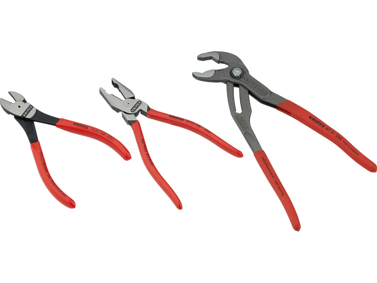 Lieferumfang:1 x Wasserpumpenzange Knipex Cobra1 x Kraft-Seitenschneider Knipex1 x Kraft-Kombizange Knipex