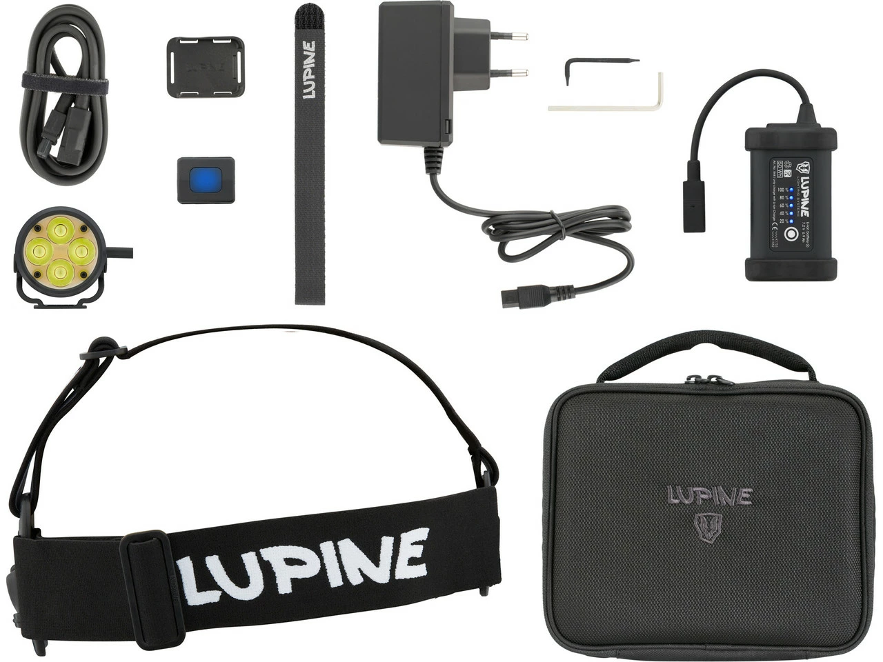 Lieferumfang:1 x Lampenkopf Lupine Wilma1 x Li-Ion Akku Lupine SmartCore 6,9 Ah1 x Fernbedienung Lupine Bluetooth1 x Stirnband Lupine mit FrontClick Halterung1 x Armbandhalter Lupine für Bluetooth-Fernbedienung1 x Verlängerungskabel Lupine 120 cm1 x Ladegerät Lupine Wiesel1 x Transporttasche Lupine Pouch M