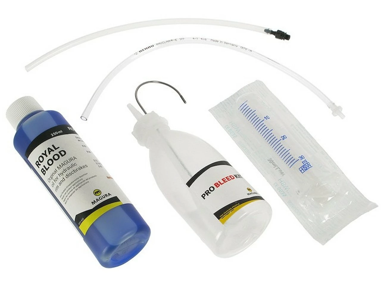 Lieferumfang:1 x Hydrauliköl Magura Royal Blood (250 ml)1 x Ersatzspritze Magura1 x Befüllstutzen Magura M62 x Befüllschlauch Magura transparent (250 mm)1 x Tropfverschluss Magura