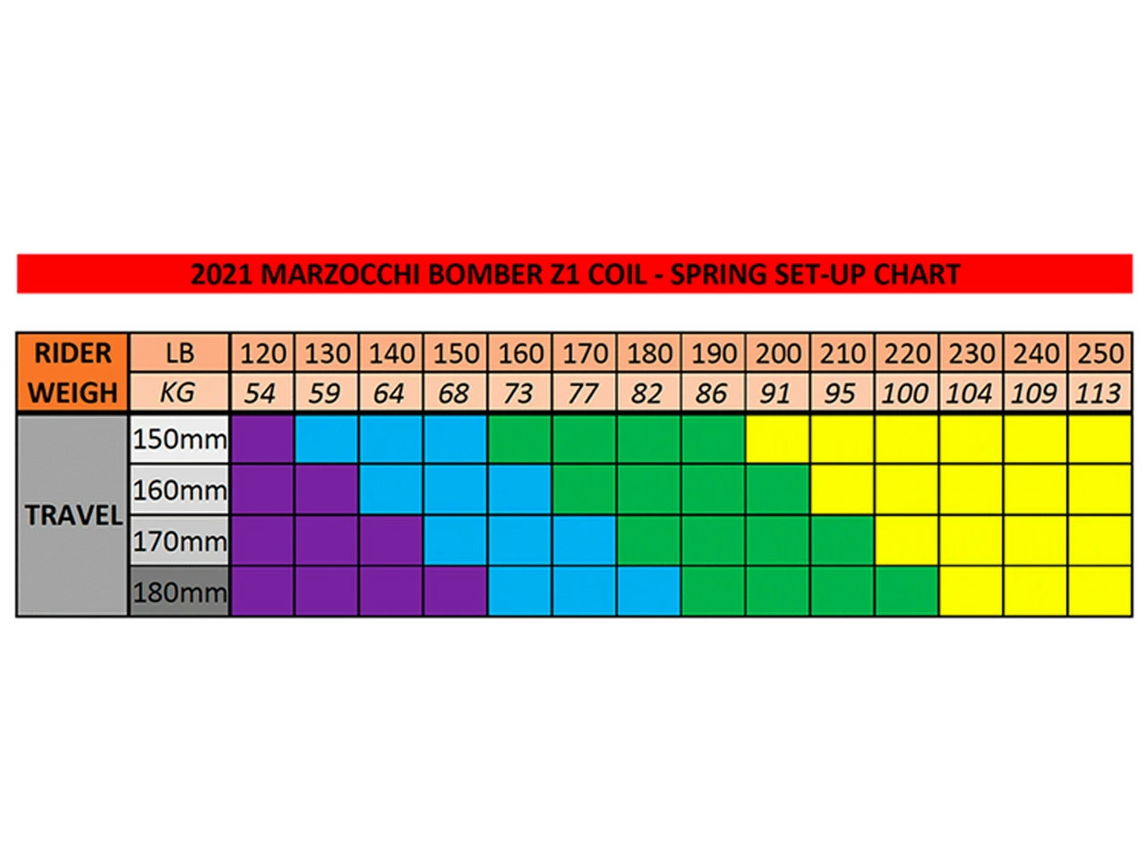 Mit der Bomber Z1 Coil bietet Marzocchi eine Federgabel an, mit einer speziell gehärteten, superleichten Silizium-Chrom-Stahlfeder. Die Vorspannung der Feder erfolgt über die Topcap und ist rein dazu da den Sag (Negativfederweg) an das Fahrergewicht anzupassen, hat jedoch keinerlei Einfluss auf die Federrate. Neben dem typischen M-Gabelbrücken-Design, bietet die Gabel einen Standrohrdurchmesser von 36 mm, einen Federweg von 150 mm bis 170 mm und eine Grip-Dämpfung mit einstellbarer Druck- und Zugstufe. Alle Gabeln werden mit einer Medium Feder ausgeliefert.
