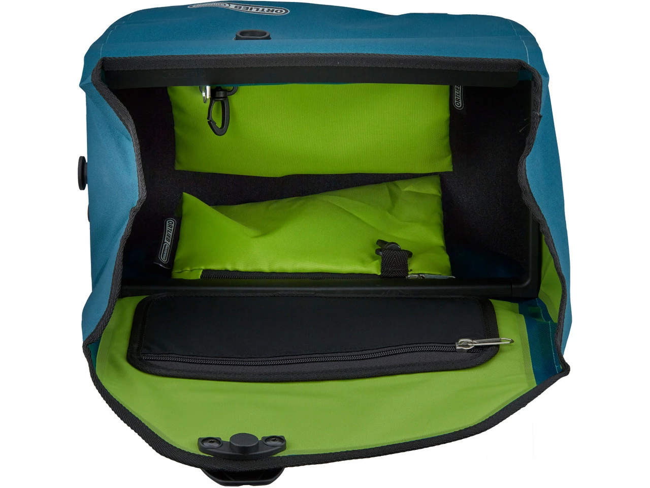 Die wasserdichte E-Trunk Tasche von ORTLIEB befestigst Du dank des Top-Lock-Adaptersystems unkompliziert auf Deinem Gepäckträger. Mit 10 Liter Volumen schafft sie Stauraum für ausgiebige Touren auf Deinem E-Bike. In ihren Innentaschen kannst Du das E-Bike-Display sowie Deine Wertsachen separat unterbringen. Ihr magnetischer Deckelverschluss ermöglicht Dir schnelles Öffnen und Schließen, während Du auf der Oberseite mittels einer elastischen Kordel Deine Ausrüstung anbringen kannst. Sie hat eine Rücklichthalterung und zudem eine Aufnahme auf der Rückseite, an der sich ein Flaschenhalter befestigen lässt. Falls Dein Bike mal stehen bleiben muss, kannst Du sie durch einen Schultertragegurt außerdem jederzeit zu einer Umhängetasche umfunktionieren.
