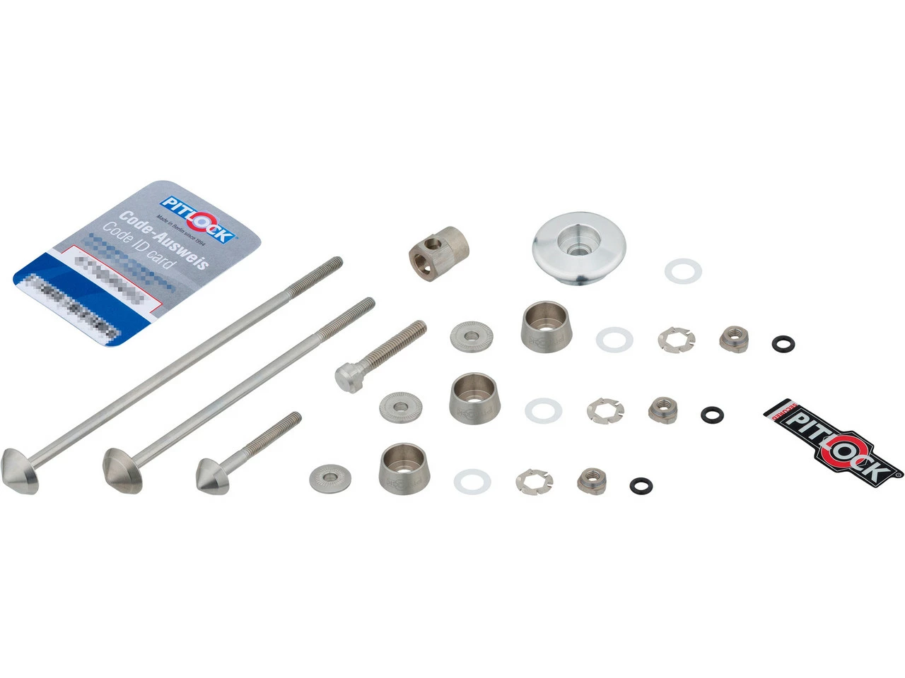 Lieferumfang:1 x Sicherung Pitlock für Hinterrad1 x Sicherung Pitlock für Vorderrad1 x Sicherung Pitlock für Sattelstütze1 x Sicherung Pitlock für Ahead-Kappe1 x Codeschraube Pitlock M61 x Schlüssel (PIT)1 x Ausweis Pitlock