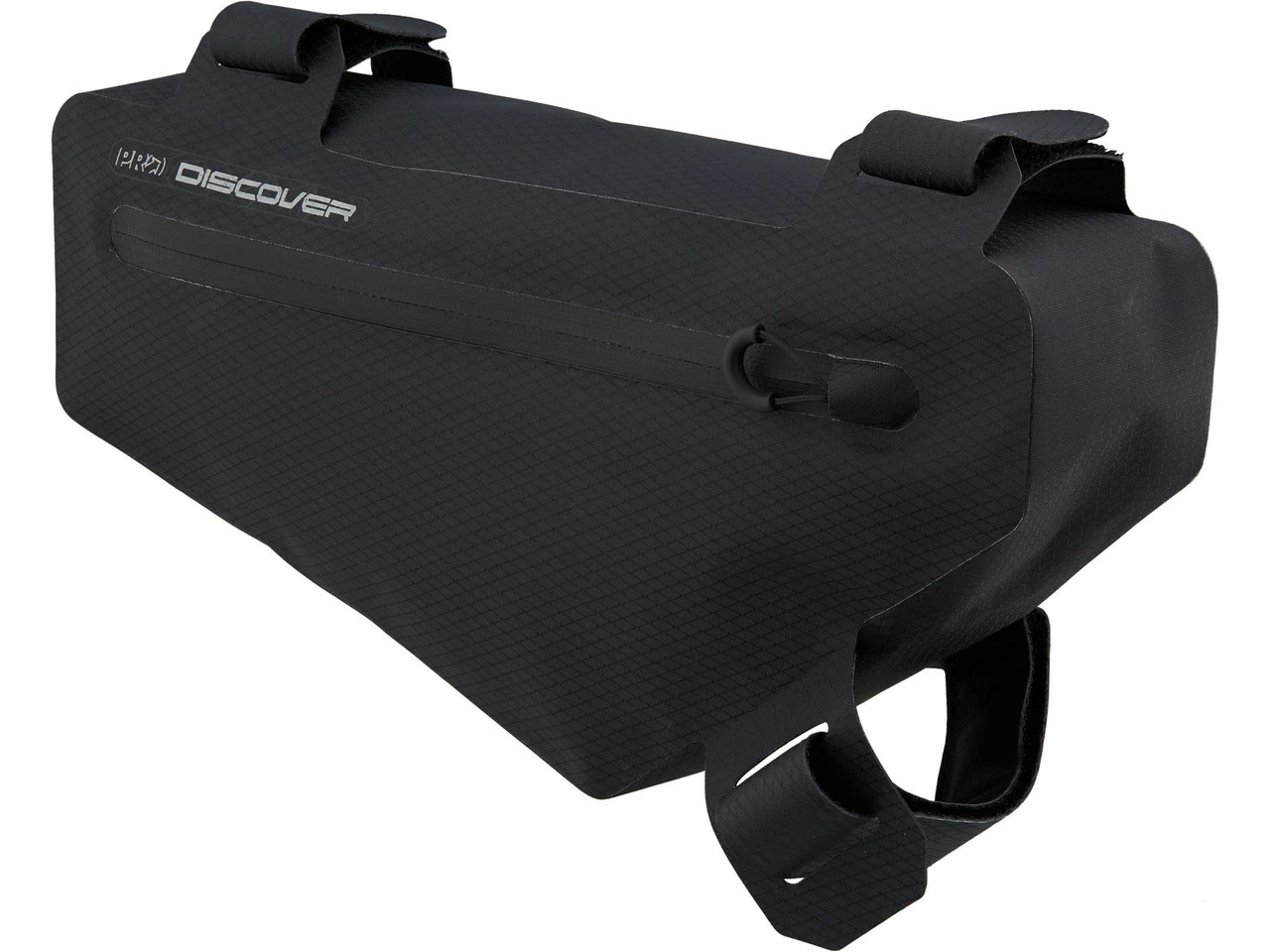 Die PRO Discover Team Small Rahmentasche bietet für kürzere Gravel-Touren 2,7 Liter Stauraum im vorderen Rahmendreieck. Sie ist wasserdicht konstruiert mit verschweißten Nähten und einem gedichteten Reißverschluss. Über Klettriemen lässt sie sich sicher befestigen.