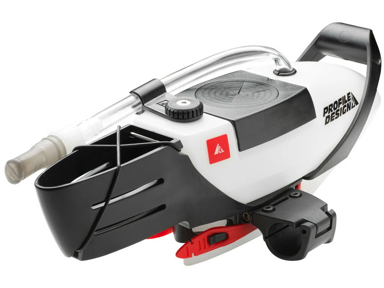 Das FC35 Triathlon-Trinksystem von Profile Design zur Montage zwischen den Extensions kommt mit verstellbarem Klemmsystem, Rückhalteband aus Silikon sowie selbstschließendem Beißventil.