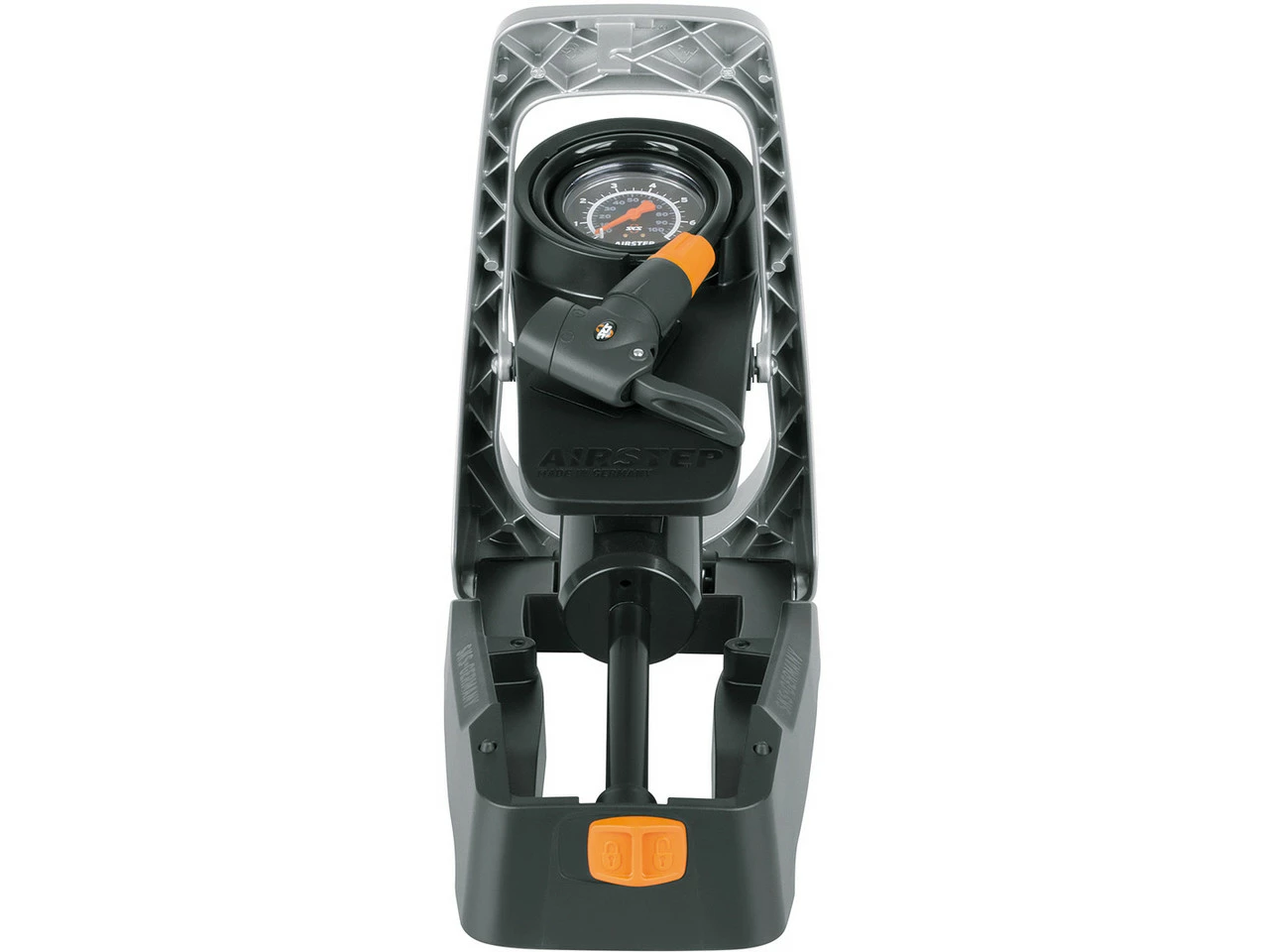 Die Airstep Fußpumpe von SKS vereint die Tugenden einer klassischen Fußpumpe mit modernster Technologie. Erstklassige Materialien, eine durchdachte Konstruktion und bedienerfreundliche Features wie das große Manometer, der integrierte Stauraum für den Spiralschlauch und der MultiValve-Kopf für alle Ventilarten verschaffen der Pumpe einen völlig neuen, innovativen Auf-Tritt. Durch ergonomisches Betätigen des Aluminium-Trittbügels in aufrechter, rückenschonender Körperhaltung kann die höchstmögliche effektive Pumpleistung bis zu 7 bar erzielt werden. Nach dem Pumpen wird der Bügel wieder heruntergeklappt und per Schalter arretiert. Anschließend lässt sich die kompakte Pumpe dank der Wandhalterung platzsparend verstauen.