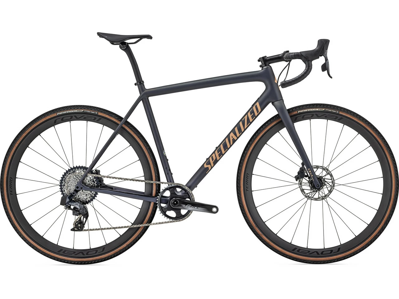 Das Specialized Crux Pro für Gravel- und Cyclocrossrennen sowie kürzere Abenteuertouren basiert auf einem außergewöhnlich leichten Carbonrahmen und kommt mit elektronischer SRAM Force 1×12-fach-Schaltgruppe. Es wurde mit Force Scheibenbremsen, Roval Terra CL Carbon-Laufrädern, Carbon-Lenker und Carbon-Sattelstütze ausgestattet. Für die Konstruktion haben die Ingenieure das Rohrdesign des Aethos übernommen, was das sensationelle Gewicht erklärt. Im Verhältnis dazu setzt das Crux auch neue Maßstäbe in Sachen Reifenfreiheit: 47 mm breite 28″ -Reifen oder 2,1″ breite 650B-Reifen sind problemlos möglich. Verglichen mit dem Diverge ist die Geometrie mit ihrem längeren Reach, dem tieferen Stack und dem höher angesetzten Tretlager auf eine sportlichere Sitzposition ausgelegt und sorgt für besondere Agilität, Wendigkeit und Responsivität. Dank seiner puristischen, klassischen Optik erinnert das Crux durchaus an ein Rennrad, wozu auch der Verzicht auf die Future-Shock- und die SWAT-Technologie beiträgt. Mit diesem performanceorientierten Offroad-Racer kletterst Du Anstiege schwerelos hinauf und fliegst über Unebenheiten einfach so hinweg.