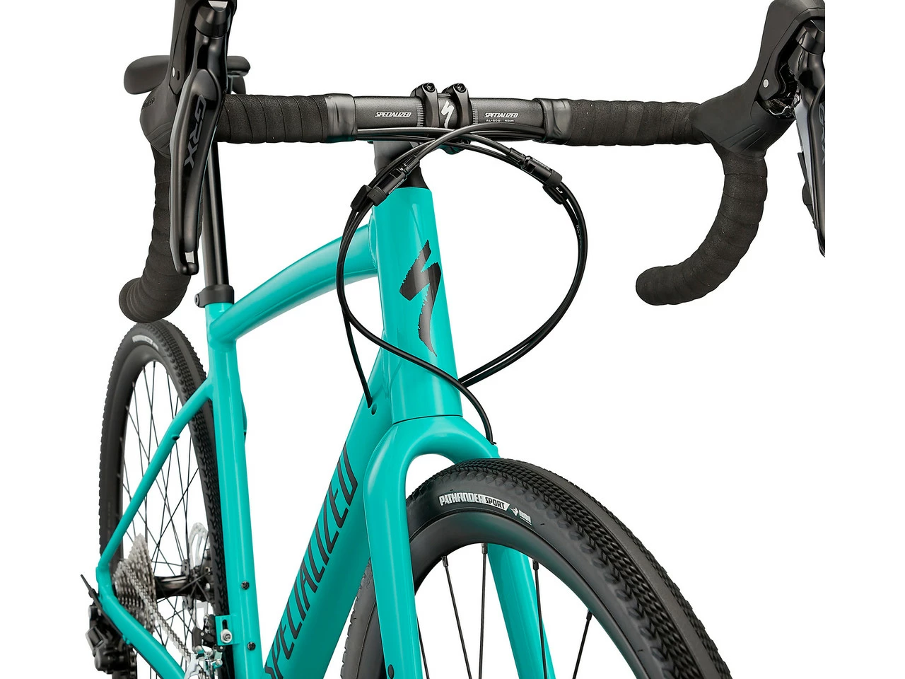 Spezifikationen:Einsatzbereich:GravelLaufradgröße:28″Größen:49 cm, 52 cm, 54 cm, 56 cm, 58 cm, 61 cmMaterial Rahmen:Aluminium (E5)Material Gabel:CarbonKomponenten:Rahmen:Specialized Diverge E5 Premium-Aluminium, Disc Flat Mount, 12 x 142 mmGabel:FACT™-Carbon, Disc Flat Mount, 390 mm Einbaulänge, 55 mm Vorlauf, 12 x 100 mmVorbau:Specialized, 7° Rise, Aluminium (3D-geschmiedet), 4 SchraubenLenker:Specialized Shallow Drop, 31,8 mm, 70 x 125 mm, Aluminium (6061)Sattelstütze:Specialized, Aluminium, 27,2 mm, 12 mm Setback, 2-fach-Klemmung, AntikorrosionshardwareSattel:Specialized Body Geometry Bridge, StahlstrebenKurbel:Shimano GRX RX600, Shimano 68 mm Innenlager, 30-46 ZPedale:ohneBremsen:Shimano GRX 810, hydraulische ScheibenbremseSchalt-/Bremshebel:Shimano GRX RX400 mechanisch 2×10-fach / hydraulischSchaltwerk:Shimano GRX RX400, 10-fachUmwerfer:Shimano GRX RX400, AnlötKassette:Shimano CS-HG50-10, 10-fach, 11-36 ZKette:KMC X10, 10-fach, mit wiederverwendbarem Missing LinkLaufräder:AXIS Elite DiscReifen:Specialized Pathfinder Sport, 700 x 38CFreigaben:Gewichtsbeschränkung:125 kg (Fahrer + Gepäck)Bremsscheibengröße max.:160 mmReifengröße max.:700 x 47C, 27,5″ x 2,1″Kettenblattanzahl:2-fach, 1-fachFeatures:für Gravel optimierte Geometrieagiles und vielseitiges BikeSmooth-Boot-Design für sauberen Übergang vom Steuerrohr zum VorbauVertrauen und Fahrstabilität in unwegsamem Geländedynamische Lenkung dank kürzerem Vorbaugrößtmögliche Reifenfreiheitmit 700C und 27,5″ (650B) Laufrädern fahrbarVielzahl an Montagepunkten für Flaschenhalter und Tascheninterne KabelführungSpecialized S-Wrap LenkerbandAluminium-Sattelklemme, 30,8 mm700 x 28-38 mm Schläuche, 48 mm SV-VentilTechnologie:FACT™