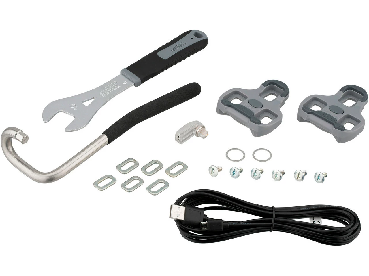 Lieferumfang:1 x Pedalkörper Look EXAKT links1 x Pedalkörper Look EXAKT rechts1 x Pedalachse Look EXAKT links mit SRM Leistungsmesssensorik1 x Pedalachse Look EXAKT rechts mit SRM Leistungsmesssensorik2 x Ladeadapterkabel mit Micro-USB-Anschluss und Magnetstecker1 Paar Pedalplatten Look Kéo 4,5°1 x Innensechskantschlüssel zum Ausrichten der Pedale1 x Maulschlüssel 19 mm