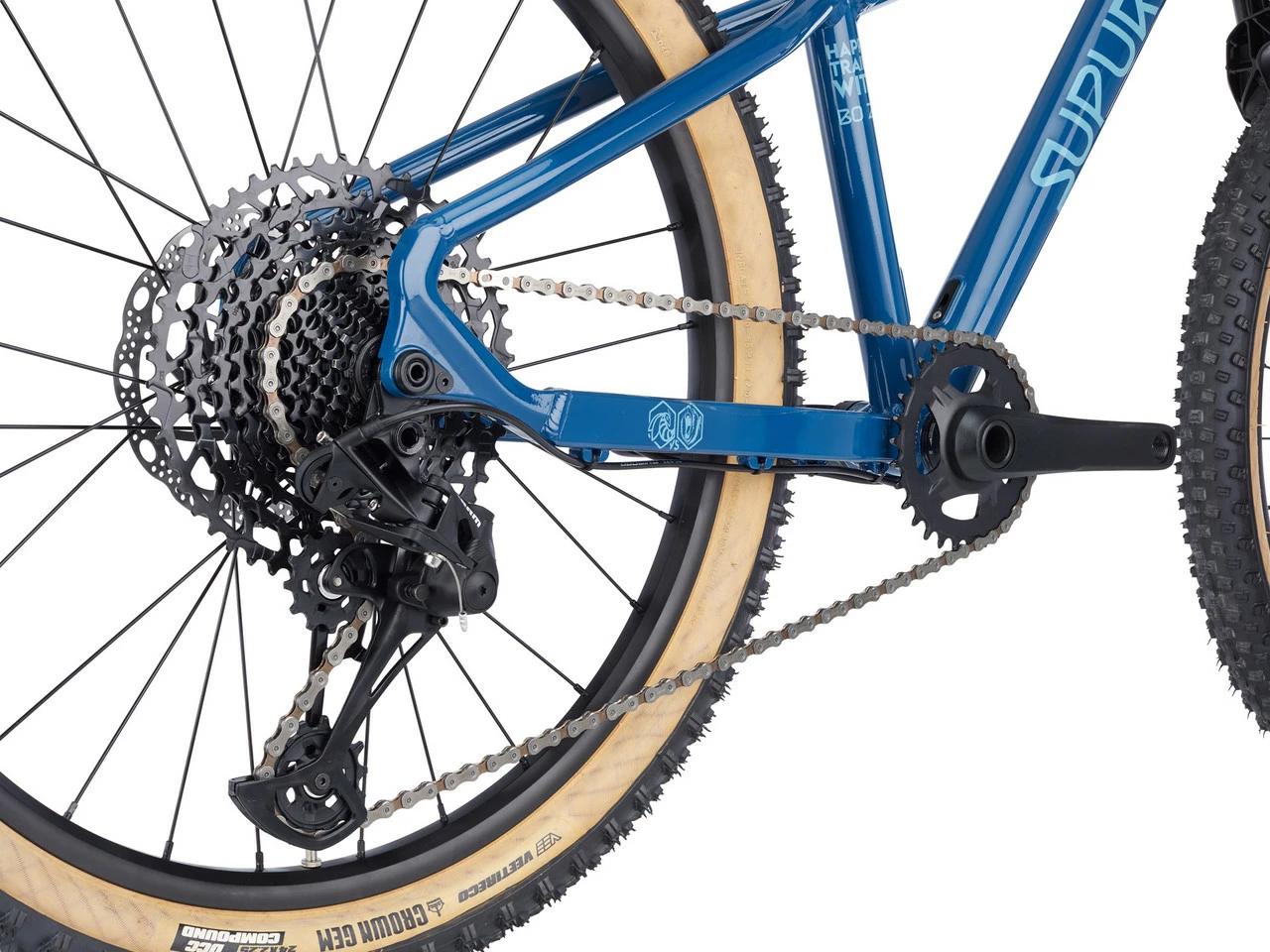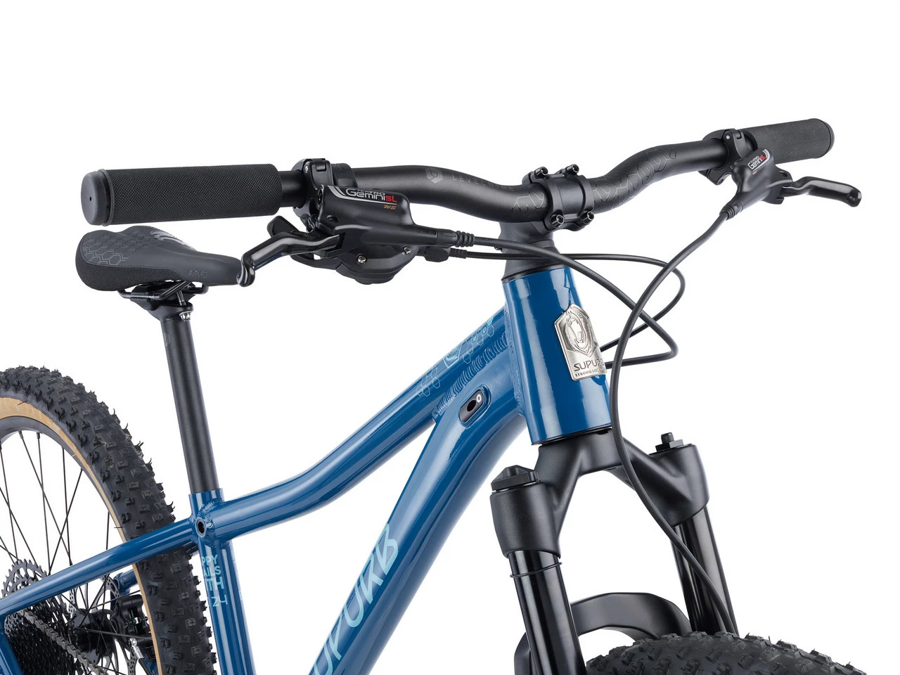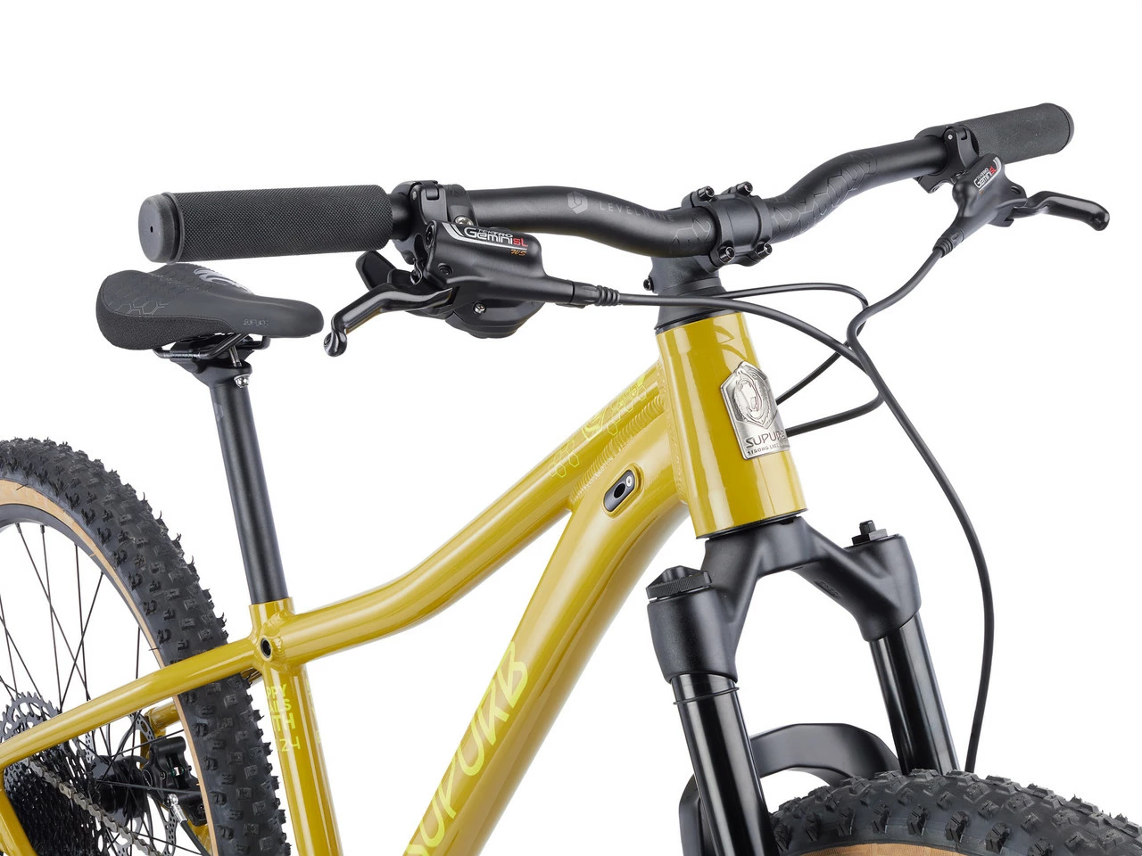 Das BO24 24-Zoll-Kinderfahrrad von SUPURB ist ein Hardtail mit Federgabel und Gangschaltung für Nachwuchsmountainbiker und eignet sich für Kids im Alter von 8 bis 11 Jahren. Damit der Spaß auf dem Bike erhalten bleibt, wurden die Bedürfnisse von Kindern bei der Entwicklung in den Mittelpunkt gerückt. Lange Kettenstreben und ein flacher Lenkwinkel führen zu einer Radlastverteilung, die auf das Fahrverhalten von Kindern optimiert ist, und zu einem tiefen Schwerpunkt. Das vermittelt viel Sicherheit bei den ersten Trailabfahrten. Da Kinder einen verhältnismäßig großen Kopf haben, der ausbalanciert werden muss, ist die Sitzposition aufrecht. Denn so kann sich Dein Kind aufs Fahren konzentrieren und ist nicht zu sehr mit der mühsamen Gleichgewichtsfindung beschäftigt. Die Junit-Comp-Federgabel von Manitou steht mit 100 mm Federweg in einem ausgewogenen Verhältnis zur Körpergröße und sorgt für ausreichend Dämpfung. Mit den 12 Gängen der leicht zu betätigenden SRAM SX-Eagle-Schaltung werden sogar steile Rampen mühelos überwunden. Auf geraden Strecken hingegen hilft das 11er Ritzel, um richtig schnell vorwärtszukommen. Die interne Zugverlegung sieht nicht nur gut aus, sondern verhindert außerdem ein Hängenbleiben an Trail-Überwuchs oder anderen Hindernissen. Kindgerechte Komponenten wie eine 150 mm kurze Kurbel, leicht zu betätigende Scheibenbremsen mit Hebelweitenverstellung, 2,25″ breite Reifen für viel Traktion und hohen Fahrkomfort und auf Kinderhände angepasste Anbauteile von LEVELNINE runden das Fahrvergnügen ab. Für fortgeschrittene Kids ist das BO24 mit einer Dropper Post aufrüstbar.