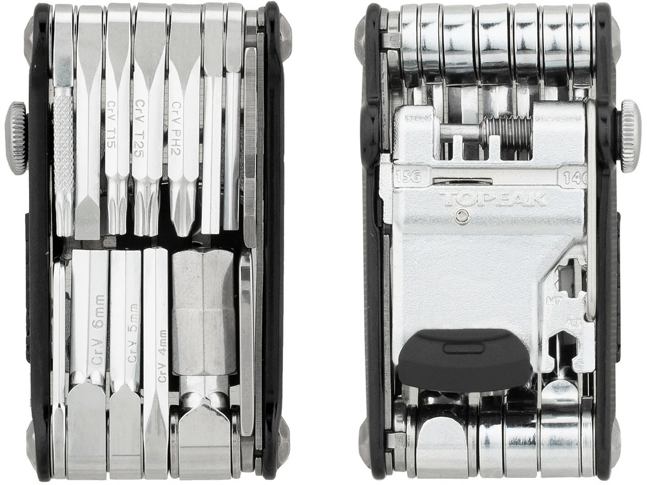 Spezifikationen:Funktion:MultitoolWerkzeugtyp:SonderwerkzeugGröße:7,4 x 4 x 1,9 cmTechnische Daten:Material Werkzeuge:Stahl (CrV)Material Körper:AluminiumMaterial Kettennieter:Stahl (CrMo)Material Bremsbelagspreizer:Fiberglas-CompositeFunktionen:Innensechskant: 2L / 2,5 / 3 / 4 / 5 / 6 / 8 / 10 mmTorx: T10 / T15 / T25Schraubendreher Kreuz PH#2, FlachkopfSpeichenschlüssel: 14G / 15G / Mavic M7 / 4,5 mm für ShimanoKettennieter (nicht kompatibel mit Campagnolo 11-fach Hollow Pin Ketten)KettenfixierhakenKettenschlosswerkzeugReifenheberMesser mit FeststellfunktionNietstiftbrecherBremsbelagspreizerPlug-EinstecherAufreiberFeatures:30 Funktionengeschmiedeter Aluminiumkörperverlängerter Hebel durch Ausklappen der WerkzeugeFach für KettenschlossNeoprentascheLieferumfang:1 x Multitool Topeak Mini PT301 x Tasche Topeak Neopren